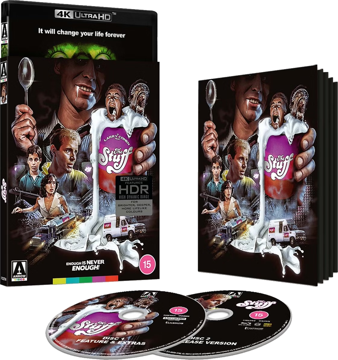 The Stuff in 4K looked pretty much stunning! For the most part, yes Arrow knocks it out of the park again. With this crisp looking beautiful transfer, one scene in particular caught my eyes. That being the colourful supermarket scene in the early stages of the film. The colour pallet absolutely shone on the 4K format. The picture quality had a vibrant look to it and is certainly a visible improvement from their previous Blu-Ray release. The tub of “The Stuff” itself with it’s bright Pink wrapper and white logo looked gorgeous and felt like it could emerge from out of the screen and fall onto my lap. So overall I will recommend this 4K from Arrow. It boasts a really good picture quality and totally delivers.